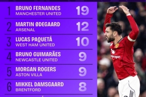 2025年英超助攻榜:B费12次居首,摩根·罗杰斯10次第二