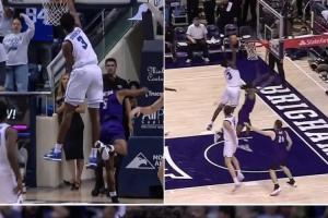 NCAA常规赛,杨百翰大学对阵艾柏林基督大学,迪班萨上演炸裂单手隔人补扣。