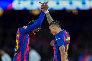 拉菲尼亚还在亚马尔因一次严重的犯规铲倒后挺身而出,他走到比利亚雷亚尔的替补席前,在被前巴萨球员特纳斯拉住的情况下,质问其中一名球员“你是谁?”无论是保护队友还是必要时对他们进行批评,拉菲尼亚都展现了他的领导才能。