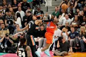 与马刺的二番战也在复现一些之前管用的内容。文班亚马只要站在底角与油漆区之间的位置,他就能覆盖护筐和弱侧的投篮干扰,这其实等于废掉了雷霆阵地战进攻的一半场地,而马刺领防人会把雷霆持球人往这一半场地送。SGA和杰伦在文班的防区难有作为,文班很容易就能形成干扰。