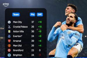 体育资讯12月25日讯 英超前17轮过后,转播商亚马逊统计了英超20队本赛季相较上赛季圣诞节时(当时为16轮)的积分差距。