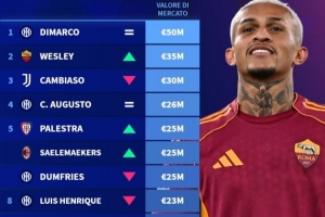 体育资讯12月25日讯 德转本周更新了意甲最新身价,今日德转晒出了意甲边后卫的身价TOP10榜单,迪马尔科5000万欧继续排在第一,罗马右后卫韦斯利升至3500万欧超越坎比亚索来到第二位。