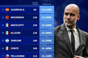 1.瓜迪奥拉:25.1亿欧,引进96人