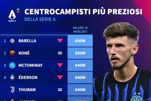 体育资讯12月27日讯 德国转会市场统计了意甲中场中路球员的身价,并列出榜单,巴雷拉6000万欧居首。