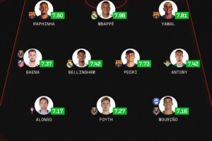 体育资讯12月27日讯 Sofascore评出了2025年西甲最佳阵容,姆巴佩、拉菲尼亚、亚马尔组成三叉戟。