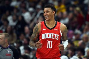 本场比赛,火箭前锋小贾巴里·史密斯高效发挥,打了38分钟14投8中,三分11中5、罚球2中1拿到22分10篮板2助攻2盖帽,也有4失误,正负值+21。